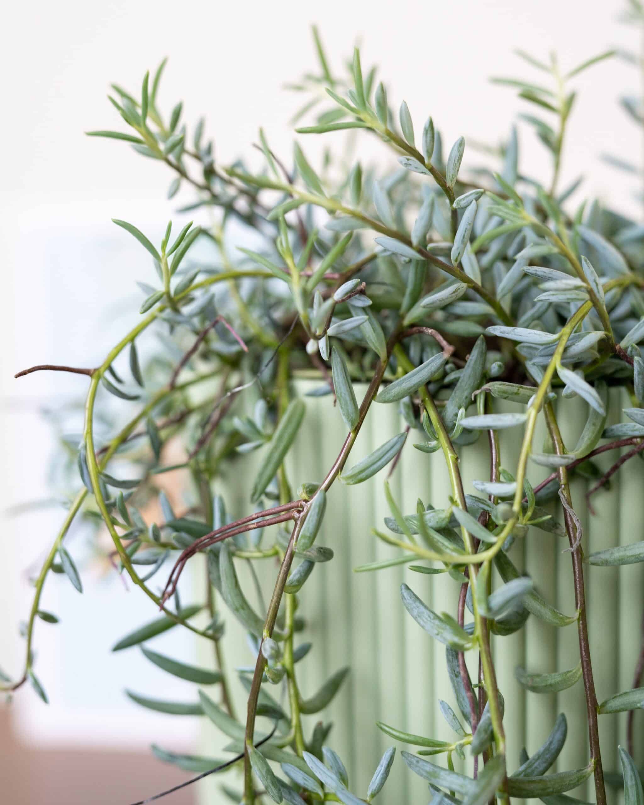 Because these plants are trailers, with proper care it can grow up to 3 feet long, making it a great choice for hanging baskets or as a cascading plant on a shelf. However, like many succulent plants, the String of Dolphins is toxic to pets and humans if ingested, so keep it out of reach of children and pets.