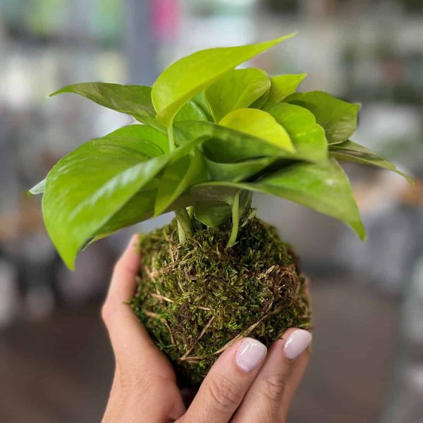 Wrapped in the Kokedama “moss ball” method, this easy care, fast growing Neon Pothos indoor plant makes a great gift!