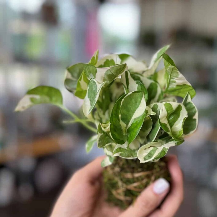 This beautiful Pearls and Jade hanging Pothos plant is hand tied in moss using the traditional Kokedama method. The moss retains moisture for easy watering, easy care, and may be hung or set in a dish for display.