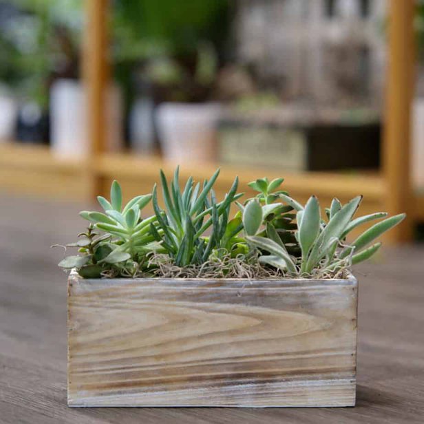 A wooden garden box filled with a delightful variety of succulents. Shapes, sizes and colors of succulents will vary depending on available stock.